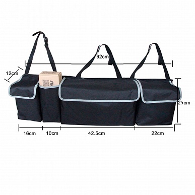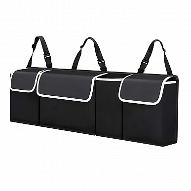 Органайзер автомобильный подвесной для багажника и салона, черный с отделениями и крышками.