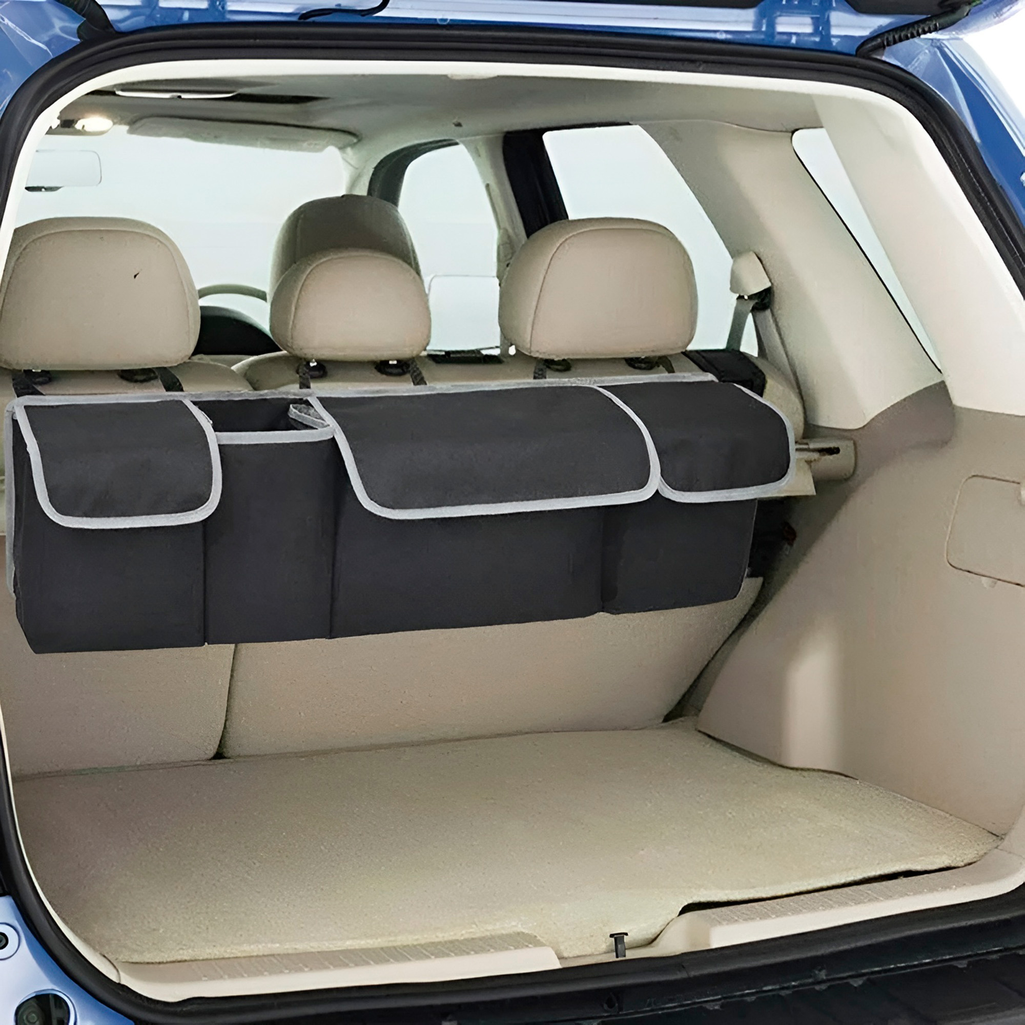 Органайзер автомобильный подвесной для багажника и салона, черный с отделениями и крышками.