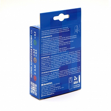 • Полностью на русском языке• Откалиброван на значение 0,35 ‰ (алкоголь в крови),