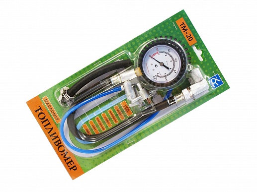 Измеритель давления топлива (топливомер) и давления масла ТМ-20 используется для измерения давления в системах впрыска топлива инжекторных автомобилей ВАЗ и ГАЗ (8 и 16 клапанных), и некоторых иномарок. Также ТМ-20 используется для измерения давления в системах подачи масла для смазки элементов двигателя. Укомплектован наконечником с резъбой М14х1.5. Подходит для двигателей автомобилей ВАЗ, ГАЗ, Alfa Romeo, Citroen, Fiat, Lancia, Opel, Peugeot, Renault, Saab, Seat, Volvo и др.Конструкция прибора