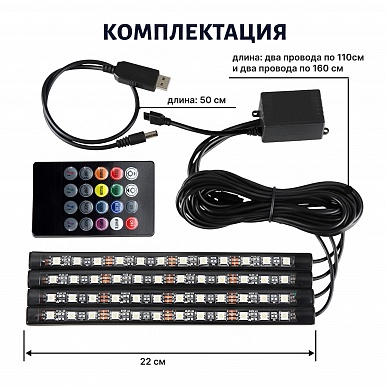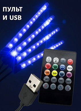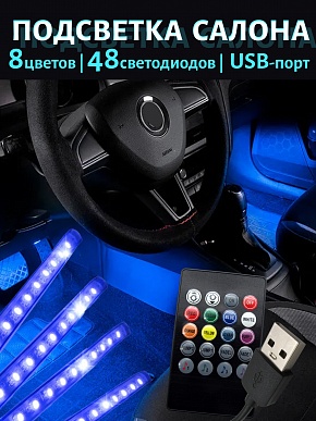 Подсветка салона USB (4 планки по 12Led, 8 цветов, светомузыка, пульт)