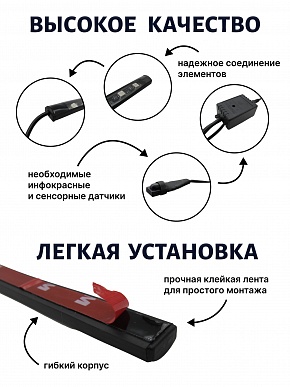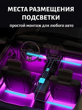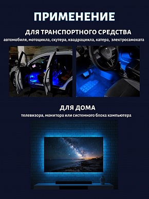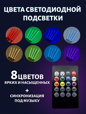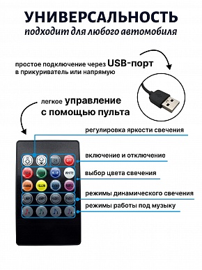 Яркая и эффектная LED-подсветка для салона автомобиля с синхронизацией света под музыку. Модель оснащена 12 светодиодами на каждой планке, поддерживает 8 основных цветов и 4 режима работы (пульсация, строб, плавная смена, режим «по биту»). Управление — удобный инфракрасный пульт дистанционного управления. Идеально подходит для интерьера, создания атмосферы и зрелищной подсветки ног, приборной панели или багажника.Преимущества