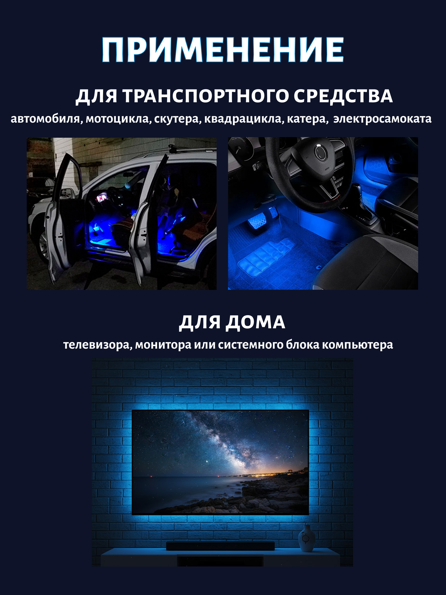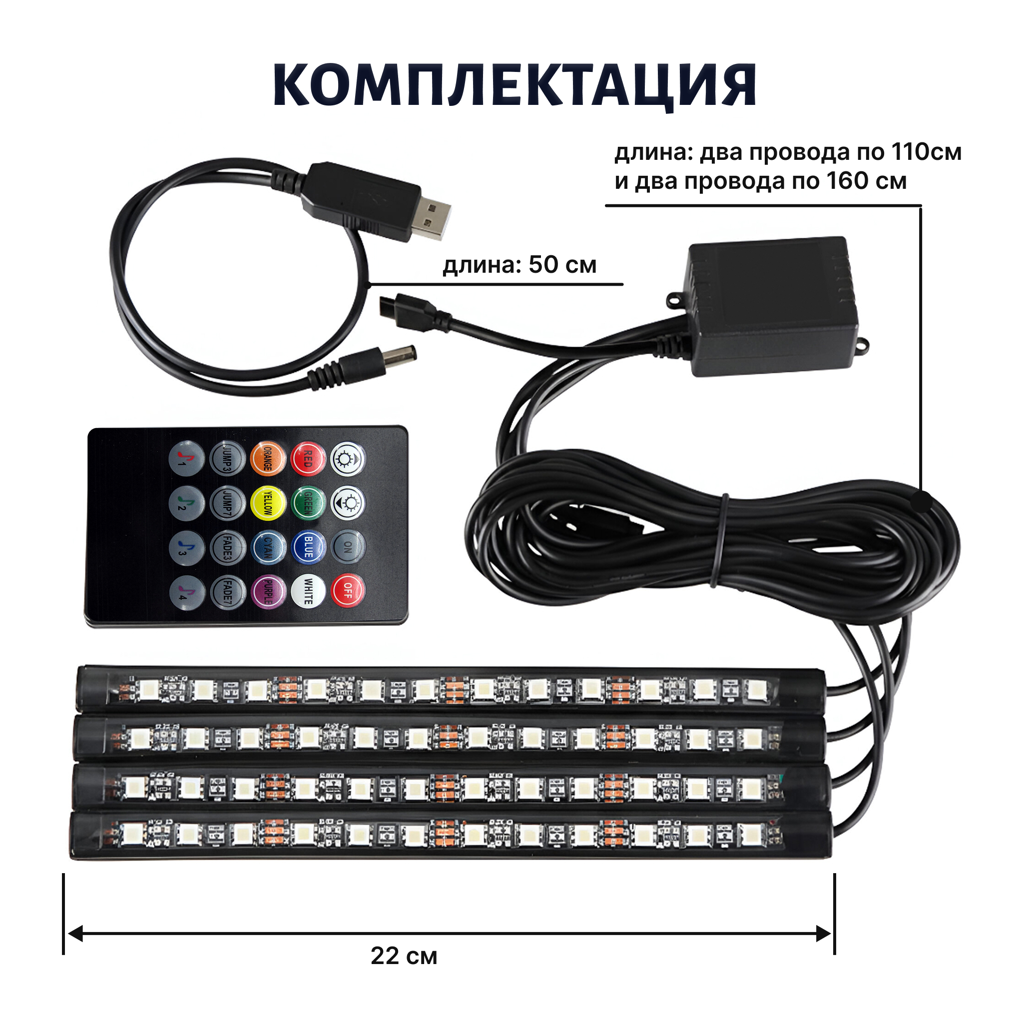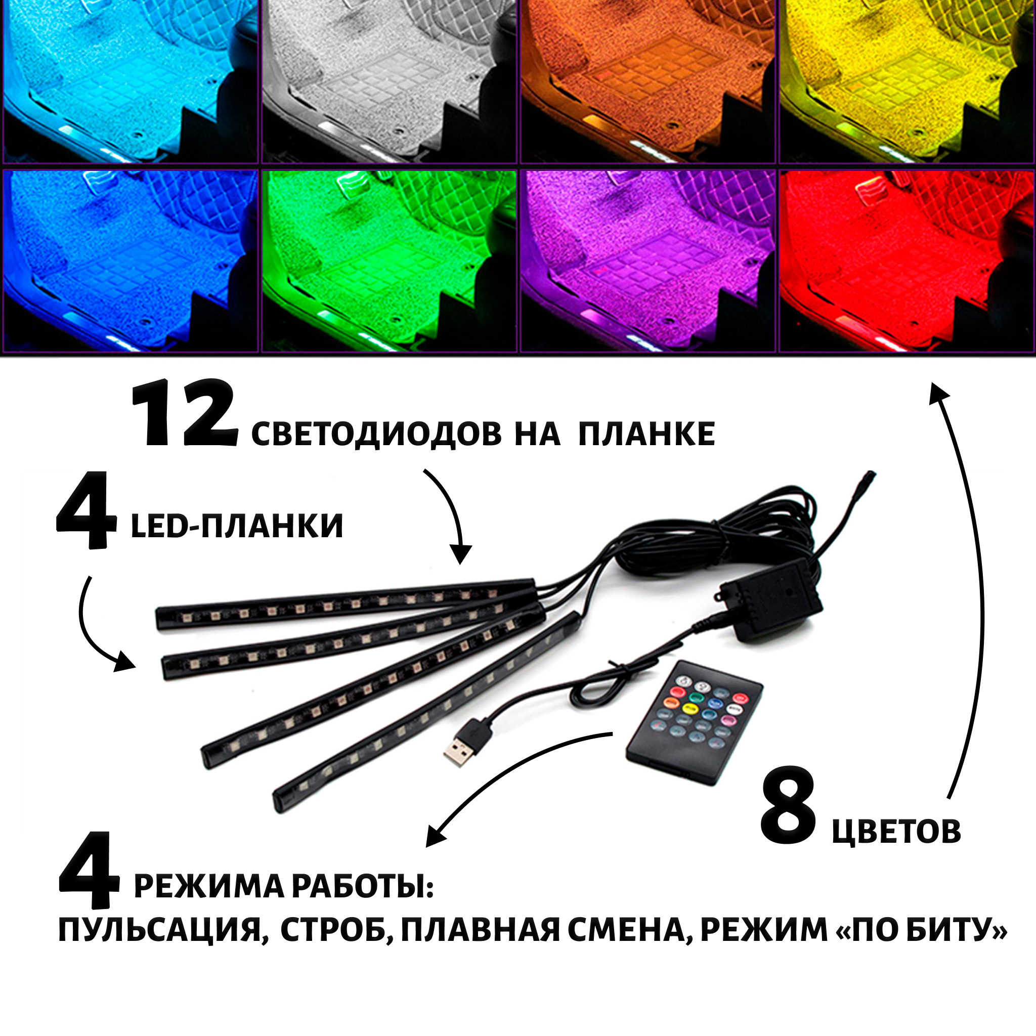 Яркая и эффектная LED-подсветка для салона автомобиля с синхронизацией света под музыку. Модель оснащена 12 светодиодами на каждой планке, поддерживает 8 основных цветов и 4 режима работы (пульсация, строб, плавная смена, режим «по биту»). Управление — удобный инфракрасный пульт дистанционного управления. Идеально подходит для интерьера, создания атмосферы и зрелищной подсветки ног, приборной панели или багажника.Преимущества