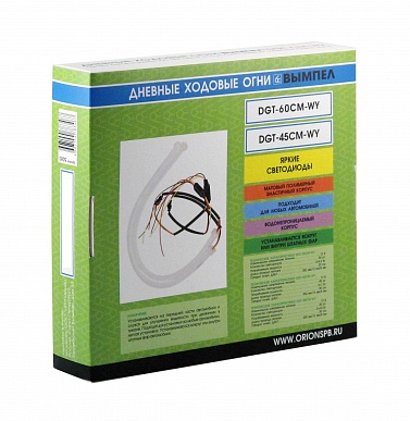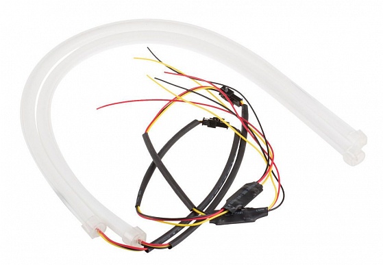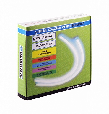 Автомобильные ходовые огни DGT-60CM-WY состоят из 115 сверхъярких светодиодов установленных внутри полимерной эластичной трубки с матовой рассеивающей поверхностью. Корпус влагозащищен. Ходовые огни устанавливаются на передней части автомобиля или внутри штатных фар и служат для улучшения видимости транспортного средства в светлое время суток, а также для придания уникального внешнего вида и эстетичности.Особенности