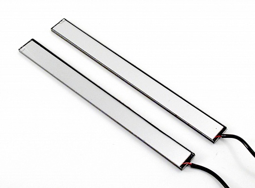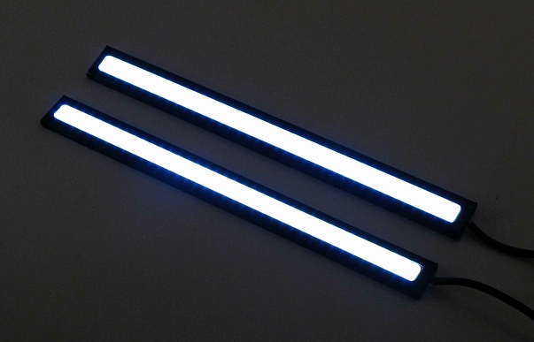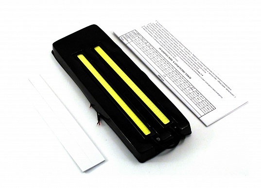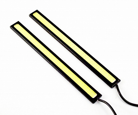 Автомобильные ходовые огни DRL-17,5 см состоят из 100 светодиодов, объединенных в одну матрицу. Корпус выполнен из металла. Данная модель легко фиксируется с помощью липкой ленты.