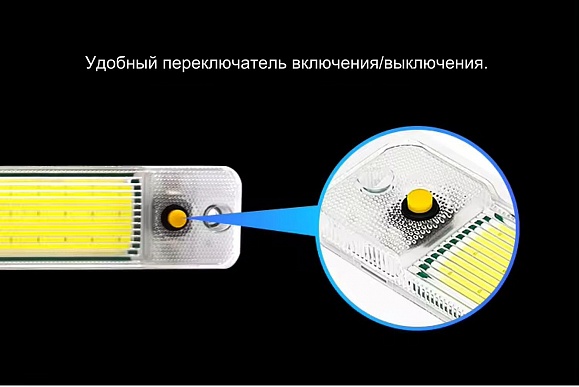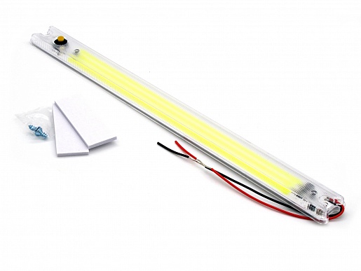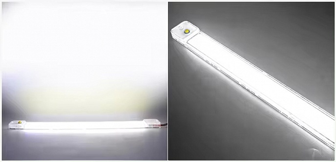 Удобная светодиодная подсветка, которая работает как с 12В, так и с 24В питанием. Крепление на саморезы или скотч. Например, возможна установка на потолок кабины грузового автомобиля. Подключение через провод.Назначение