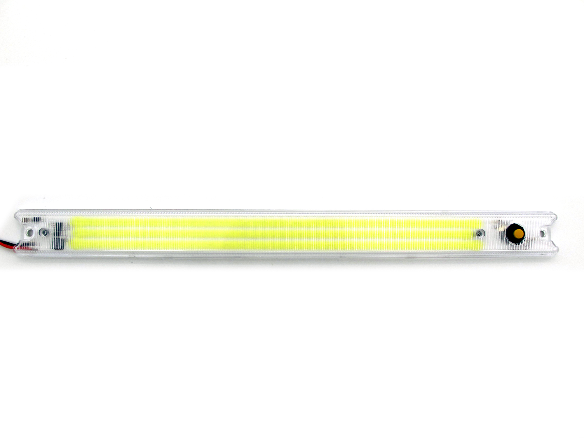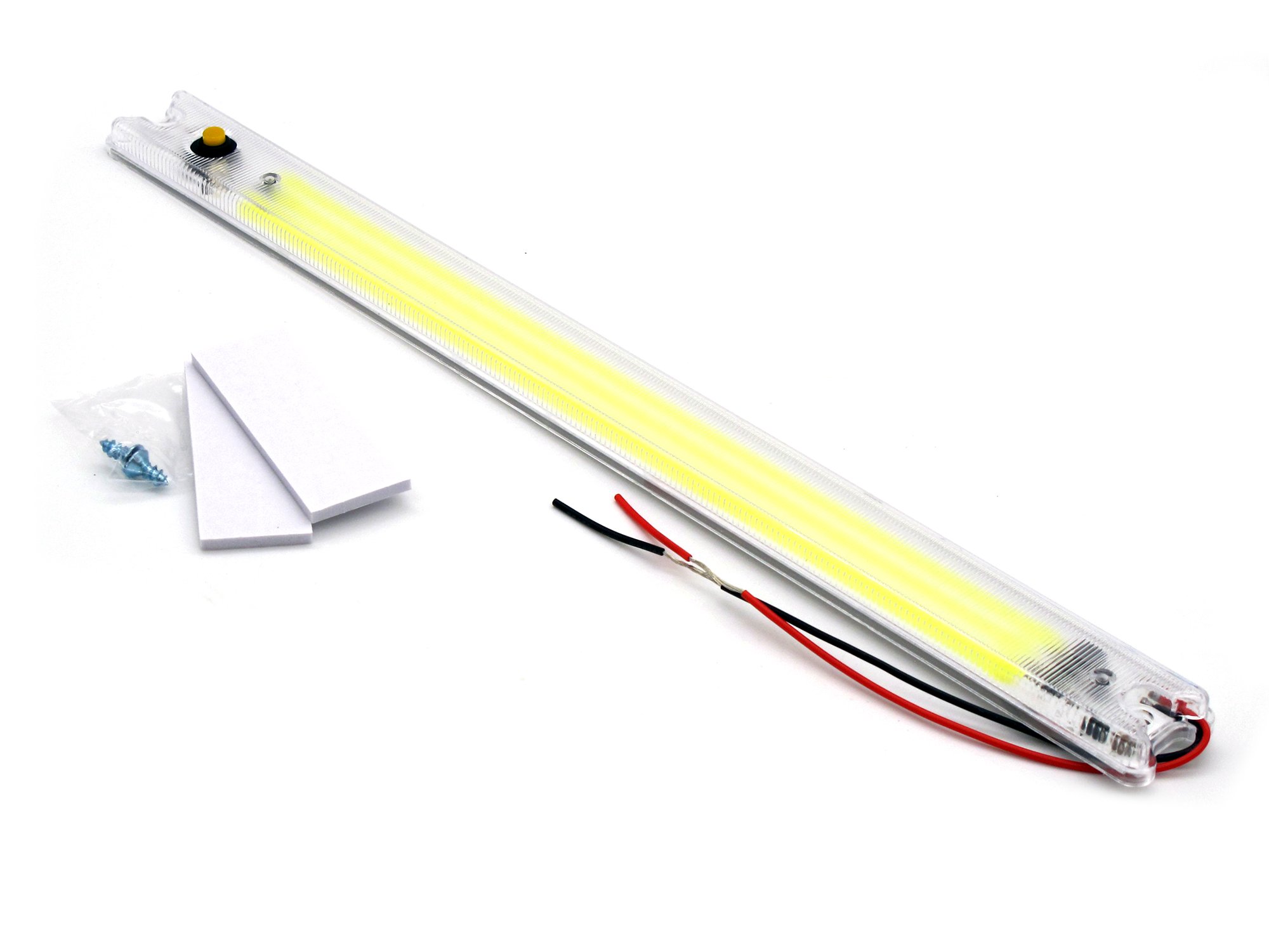 Удобная светодиодная подсветка, которая работает как с 12В, так и с 24В питанием. Крепление на саморезы или скотч. Например, возможна установка на потолок кабины грузового автомобиля. Подключение через провод.Назначение