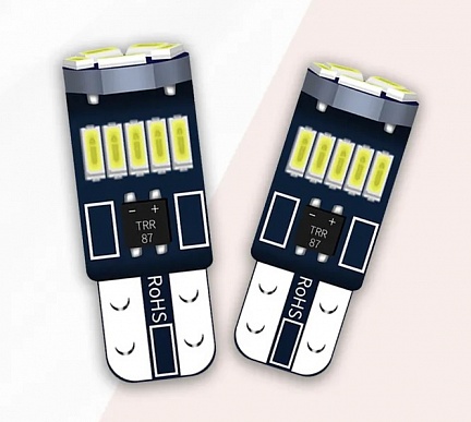 LED‑лампы T10 (W5W) с SMD4014 12в и обманкой canbus, отлично подойдут для габаритов, подсветки салона, номерного знака и приборной панели и т.д.Значительно ярче стандартных ламп накаливания и подходит на многие автомобили. Цветовая температура лампы 6000К. Лампы оснащены чипом TRR87, что позволяет не соблюдать полярность.