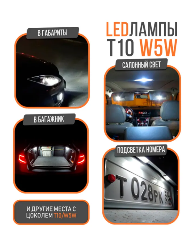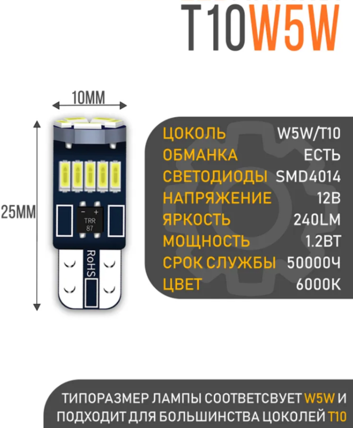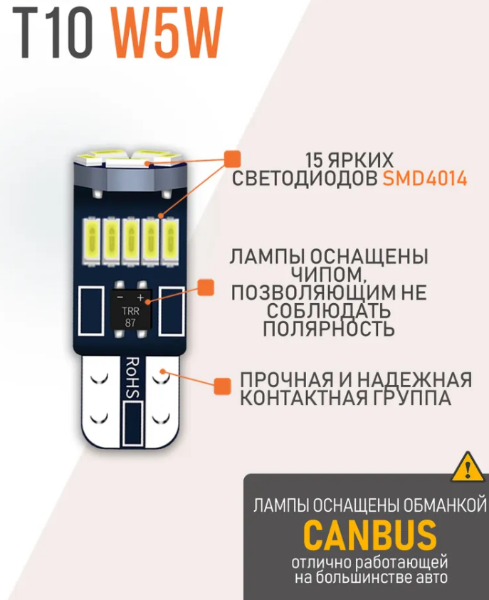 LED‑лампы T10 (W5W) с SMD4014 12в и обманкой canbus, отлично подойдут для габаритов, подсветки салона, номерного знака и приборной панели и т.д.Значительно ярче стандартных ламп накаливания и подходит на многие автомобили. Цветовая температура лампы 6000К. Лампы оснащены чипом TRR87, что позволяет не соблюдать полярность.