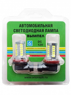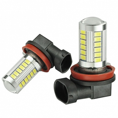 Светодиодная лампа H11 33SMD отличается интенсивным ярким свечением и длительным сроком службы за счет качественной пайки светодиодов, большого количества светодиодов (33 штуки на каждой лампе) и наличия линзы. Поскольку светодиод является точечным источником света (из-за своих малых размеров) и характеризуются малым углом рассеивания светового потока (менее 120°) наличие линзы крайне необходимо. Линза и рефлекторы позволяют создать кривые силы света, отвечающие всем требованиям правил дорожного движения, увеличить угол рассеивания (до 300°). Устройство не перегревается и обладает малым весом за счет алюминиевого корпуса. Светодиоды SMD 5630 обладают низкой инерционностью, то есть сразу начинают работать на полную мощность, а не требуют ожидания прогрева для последующего свечения. Устанавливается в штатное место.