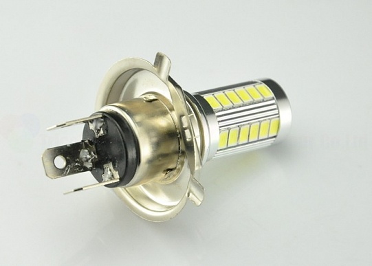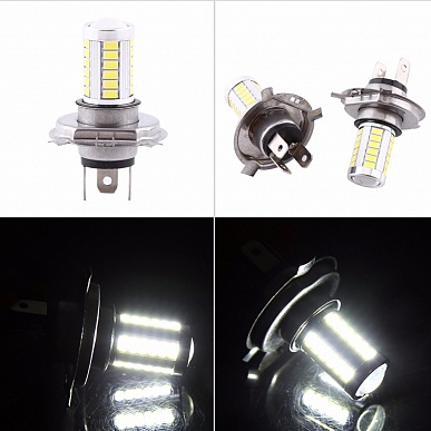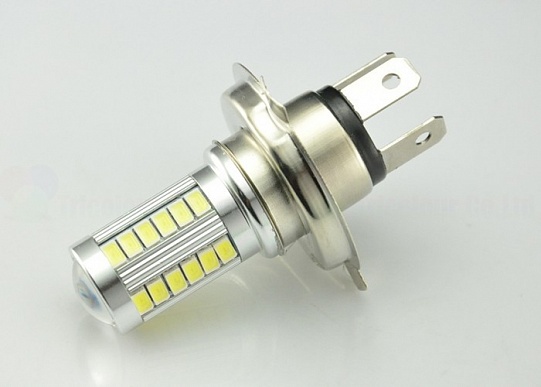 Светодиодная лампа H4 33SMD отличается интенсивным ярким свечением и длительным сроком службы за счет качественной пайки светодиодов, большого количества светодиодов (33 штуки на каждой лампе) и наличия линзы. Поскольку светодиод является точечным источником света (из-за своих малых размеров) и характеризуются малым углом рассеивания светового потока (менее 120°) наличие линзы крайне необходимо. Линза и рефлекторы позволяют создать кривые силы света, отвечающие всем требованиям правил дорожного движения, увеличить угол рассеивания (до 300°). Устройство не перегревается и обладает малым весом за счет алюминиевого корпуса. Устанавливается в штатное место. Совместимо с фарами ближнего и дальнего света.